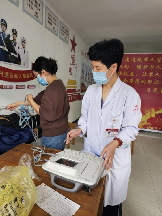 功能科裘慈芳主任说:“再忙,也不能放过任何一个异常波形。”心电图检查区域门庭若市,她严谨地为每一位村民的检查。