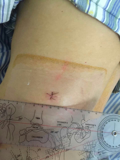 手术切口约1cm,局麻下进行,患者在整个过程中都处于清醒状态。根据术中沟通,随着突出椎间盘的逐渐摘除,神经根受压的逐渐解除,患者左下肢自我感觉逐渐变得轻松、放松,疼痛也一点一点地减轻。手术结束,患者左下肢的疼痛、拉紧感症状已全部解除,下肢活动较术前明显好转,术前抬高到30°就疼痛不止的左腿已能轻松地抬高到90°了。第二天查房时,患者开心地告知,手术当天已下床活动上厕所了,行走时腰部疼痛明显缓解,左下肢无痛,行走平稳,术后第三天出院(建议术后卧床24小时后,再适当下床活动。术后卧床休养配合腰背肌功能锻炼适度下床活动3周后,可以逐渐正常下床活动)。