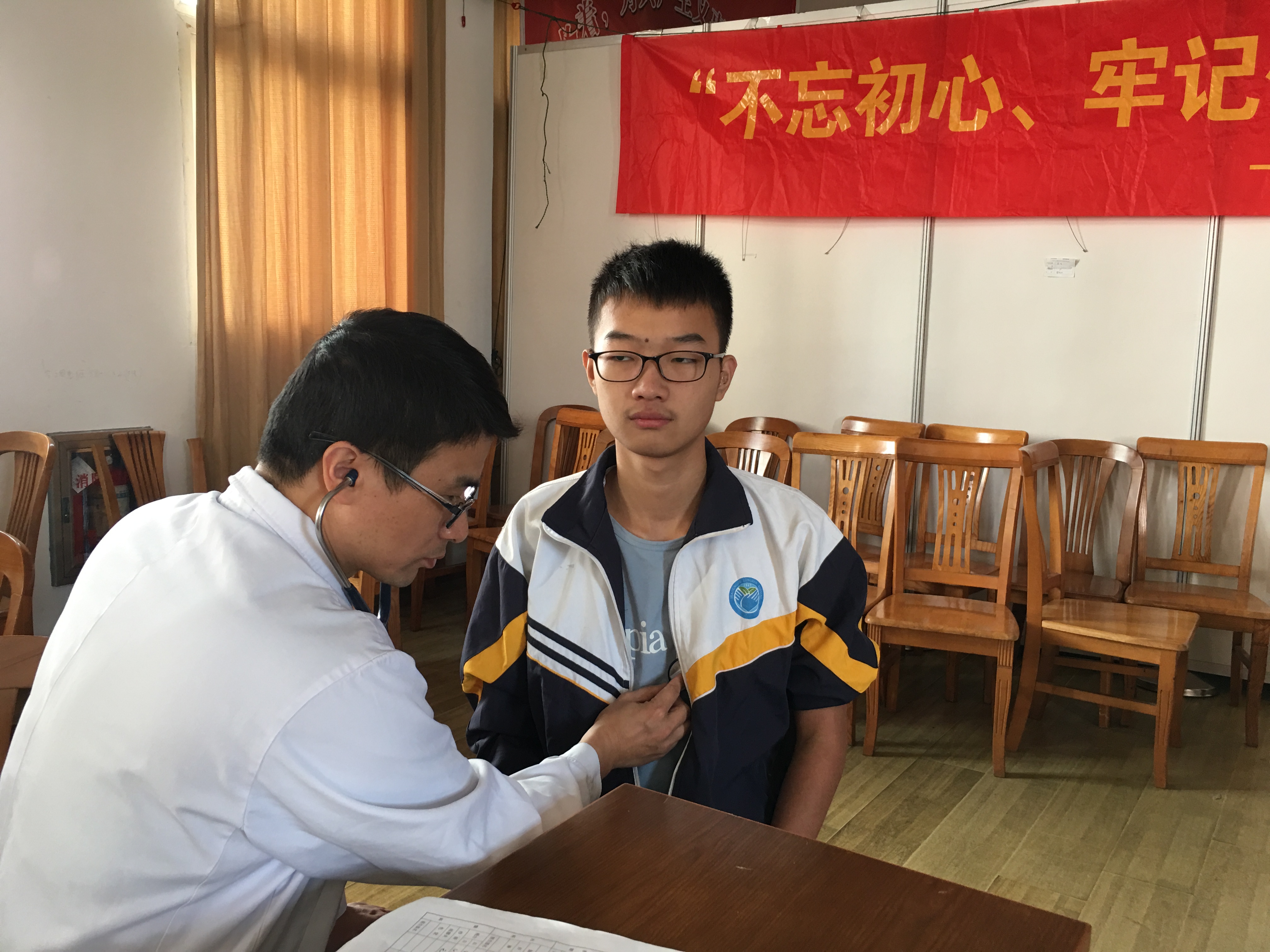 聋哑学校的学生从小学到高中,年龄跨度比较大,是一个特殊的群体。义诊活动开始时,在沟通上有一定的障碍,但同志们很快融入了这个群体,为孩子们在无声的世界中露出一个笑脸而感到高兴。好些孩子患有疾病,内科医生林明武细心地为每一位学生触诊、听诊,完成一项项体格检查。检查出异常情况的立刻与班主任老师联系,询问既往史,生怕错过了治疗。四年级一个学生特别引人关注,男孩11岁却长得矮小、耳朵流脓、皮肤溃烂,党员便主动跟老师留下联系电话,嘱咐尽早到医院就诊。