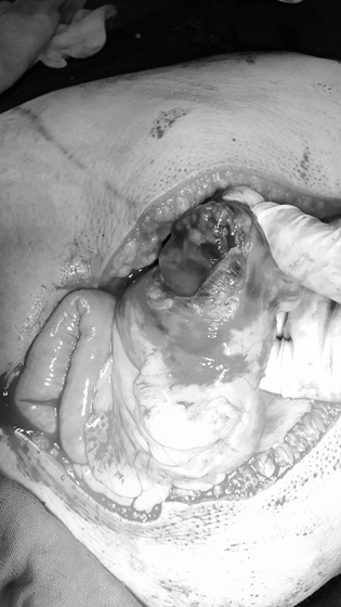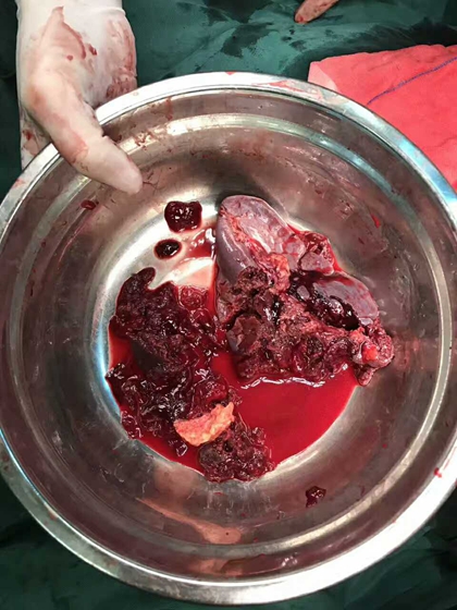 17:10病人送入手术室。手术由戚仕均副主任医师,朱大明主任医师、赵雄碧主治医师、沈学香主治医师及麻醉团队、护理团队协作完成,术中见患者腹腔大量积血不断涌出,探查见脾脏粉碎性破裂(IV级),升结肠(损伤长度约5cm)、横结肠(损伤长度约7cm)浆、肌层挫伤,部分肠系膜多处挫裂伤,肠系膜血肿,后腹膜血肿。患者有剖腹产手术史,腹腔粘连较重,这给手术早期的出血控制带来很大困难。