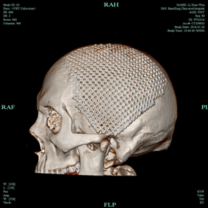 术后2月,患者再次入院,在家属的殷切期望下,我院神经外科积极完善术前准备,排除手术禁忌,于2016年1月14日,在全麻下为患者施行了“颅骨缺损修补术”,置入由计算机预先定制的个体化三维钛网,手术顺利。在十二病区医护的精心照护下,患者恢复顺利,基本恢复了原来的面貌,满意出院。