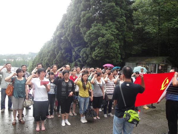 在北山革命烈士陵园,党员们神情庄重,向英烈们进行了悲痛而敬仰的三鞠躬,并在鲜红的党旗下,握紧拳头,举起右手再次对党宣誓:“我志愿加入中国共产党……对党忠诚,积极为党工作,为共产主义奋斗终身……”。